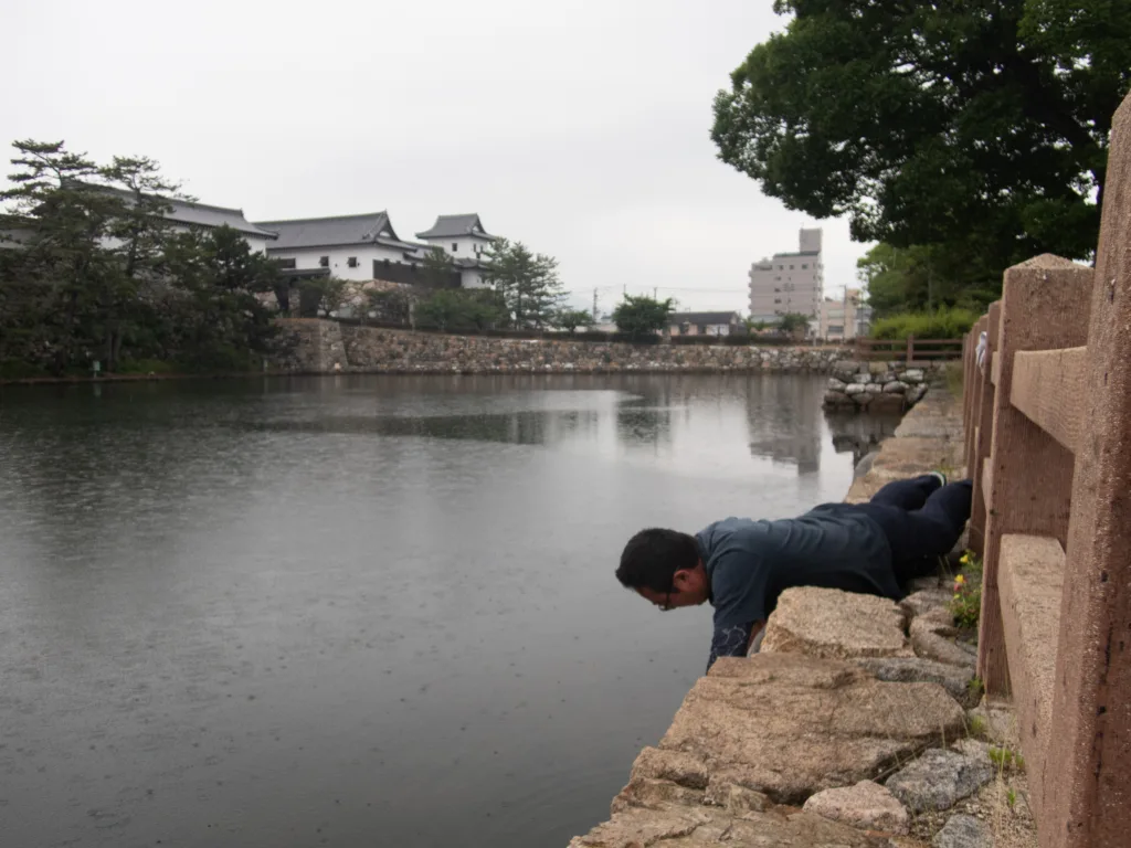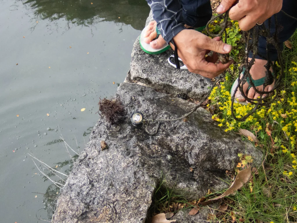 2025.06.11 今治城のお堀の環境調査(春) 今治城のお堀の春の環境調査を行いました。 年間の水温を計測するにあたりロガーの回収です。 流れのある所には、ワカメが付着していますが、流れの少ない所にはホヤがいっぱいついていました。
